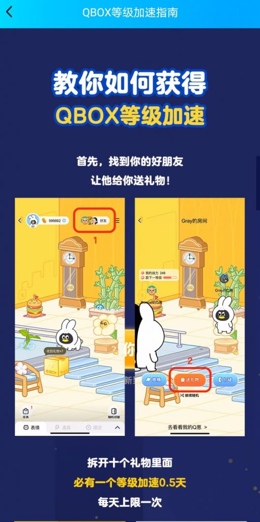 在2023年QQ上线了年度第一个加速项目:QBOX小游戏加速,规则为收10次QBOX礼物获取0.5天活跃天加速