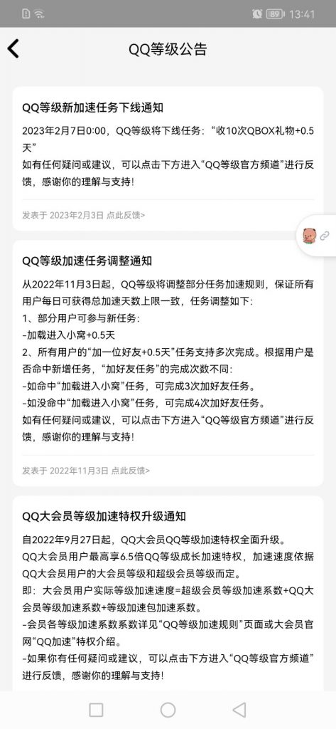 2023年2月7日0:00,QQ等级将下线任务:”收10次QB0X礼物+0.5 天”