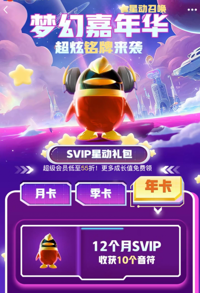 - SVIP 星动礼包:超级会员低至 55 折,购买更长时长的 SVIP 可获得更多音符。
