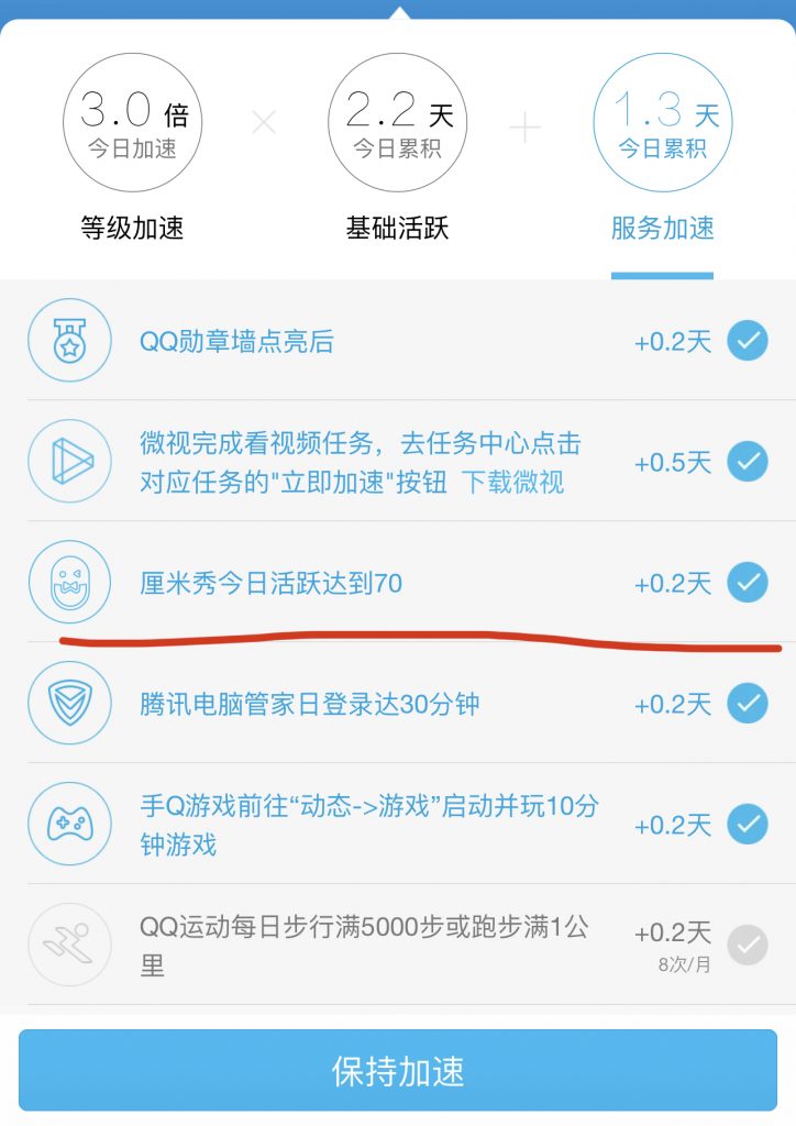 QQ已于今日推出新的加速项目“厘米秀今日活跃达到70”,每天可加0.2的活跃天