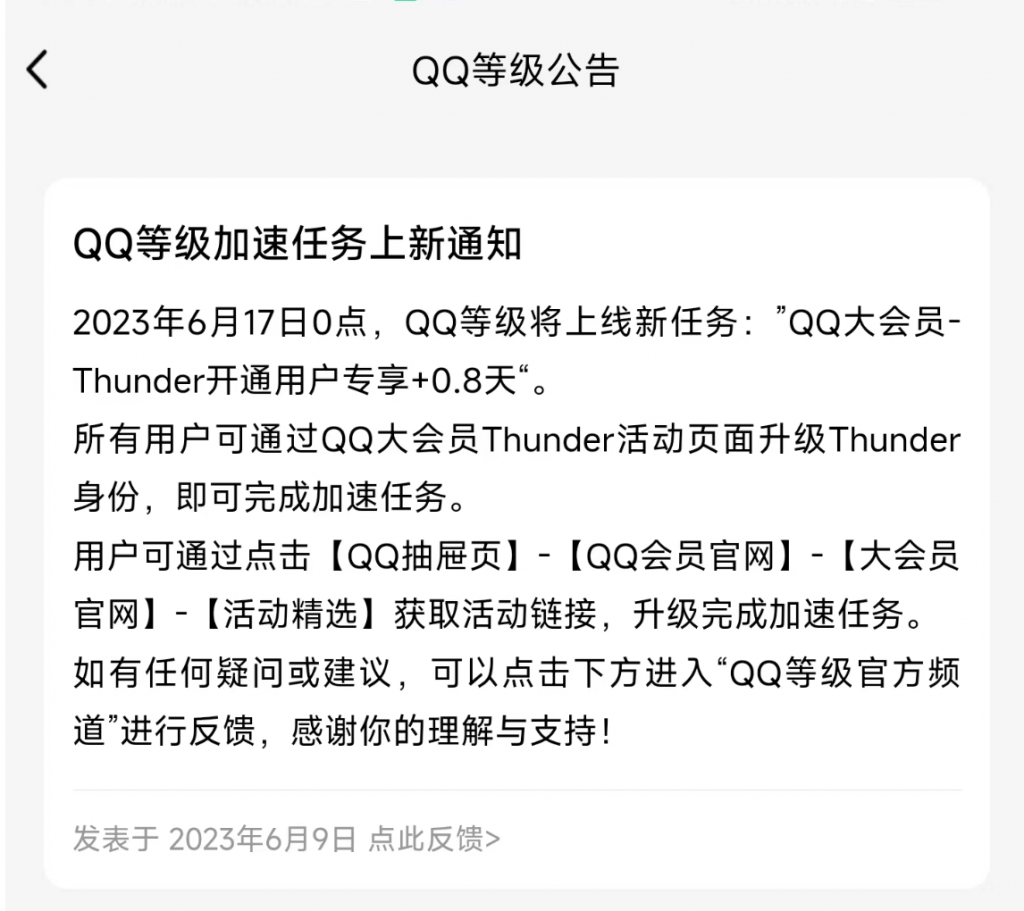 大家好!我想分享一条令人兴奋的消息。也许你已经听说过关于QQ等级加速的概念,也许你一直在探索关于QQ等级代练的各种可能。那么,这次,让我们一起迎接一个全新的里程碑——在2023年6月17日0点,QQ等级将推出一项创新任务,名为”QQ大会员- Thunder开通用户专享+0.8天”。