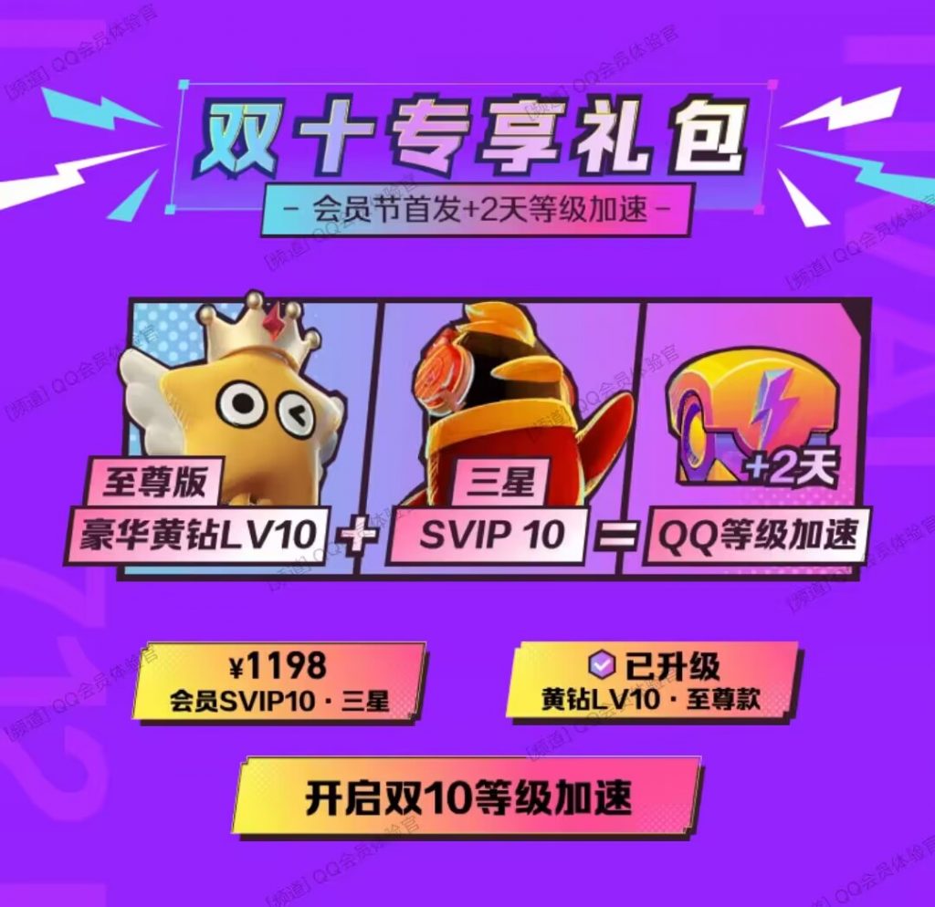 活动期间,还有双十专享礼包,会员可以享受首发+2天的等级加速,由至尊版豪华黄钻LV10和三星SVIP10组成:+2天QQ等级加速。这对于追求高QQ等级的用户来说,无疑是一个非常好的福利。