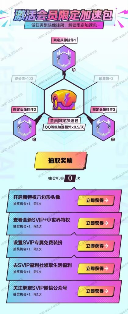 活动的任务内容非常丰富,包括开启新特权六边形头像、查看全新SVP+小世界特权、设置SVP专属免费装扮、去SVP福利社领取生活福利和关注绑定SVP微信公众号。只要完成这些任务,就可以获取抽奖机会,其中每个任务只能获取1次抽奖,最多可以获取5次。这是对QQ等级计算和优化的一个非常好的机会。