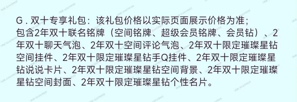 双十专享礼包的内容包括2年双十联名铭牌(空间铭牌、超级会员铭牌、会员钻)、2 年双十聊天气泡、2年双十空间评论气泡、2年双十限定璀璨星钻空间挂件、2年双十限定璀璨星钻手Q挂件、2年双十限定璀璨星钻说说卡片、2年双十限定璀璨星钻空间背景、2年双十限定璀璨星钻空间封面、2年双十限定璀璨星钻个性名片。