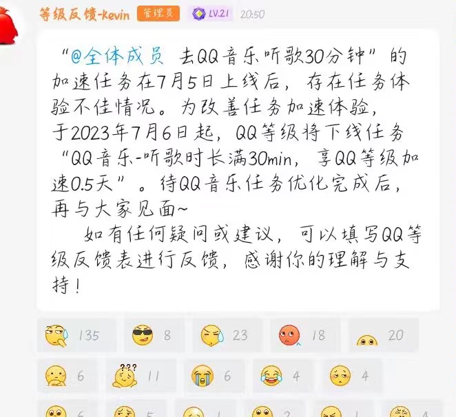 这个全新的QQ等级加速计划的启动并没有按照预期顺利进行。7月4日这一天,管理部门却再次调整了开启的时间,推迟到了7月5日。然后,在终于宣布开放的第二天,这项新的QQ等级加速任务却被突然撤下。官方的解释是,“为了提升用户任务体验,暂时下线,待优化后回归”。
