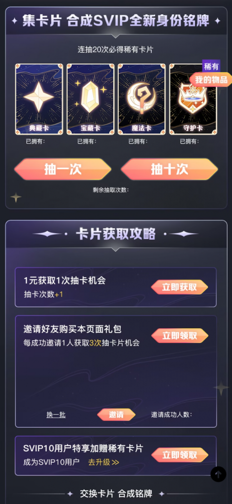 对于喜欢游戏和抽奖的用户来说,本次活动提供的抽卡机会和消费积分无疑是一大亮点。每付费1元即可获得1次抽卡机会,而且还有机会获得排行榜的积分,增加了用户的参与感和获奖的机会。