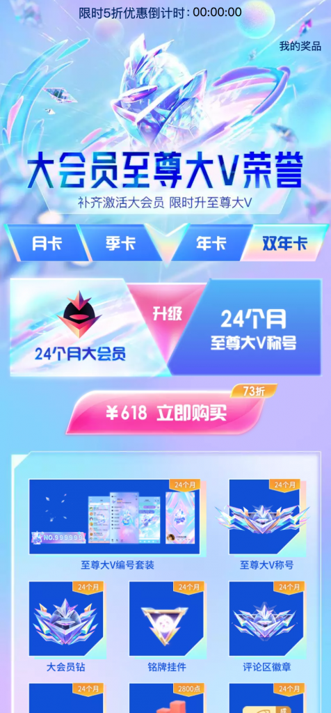- 超大V特权:- 荣誉称号资料卡展示及QQ群展示。