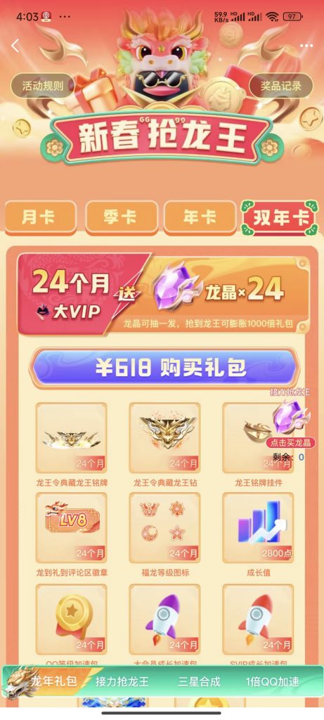 活动的最大亮点在于其多元化的礼包选择,不同的大会员礼包不仅包含了QQ等级加速包,还附赠大量成长值、龙晶及排行榜积分等丰厚奖励,从月卡到双年卡不等,满足不同用户的需求。