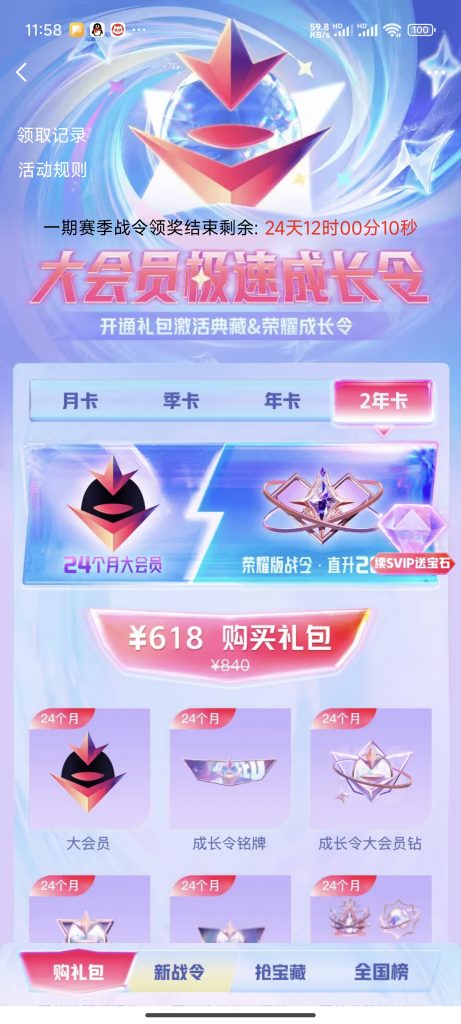 - 极速成长年卡礼包:这是最为丰厚的礼包,包含12个月的大会员服务,并赠送12个月的大会员成长加速包,每天可额外获得20点成长值。此外,用户还可以解锁荣耀版成长令,获得1000点大会员成长值和1000点成长令经验,以及更多专属福利。