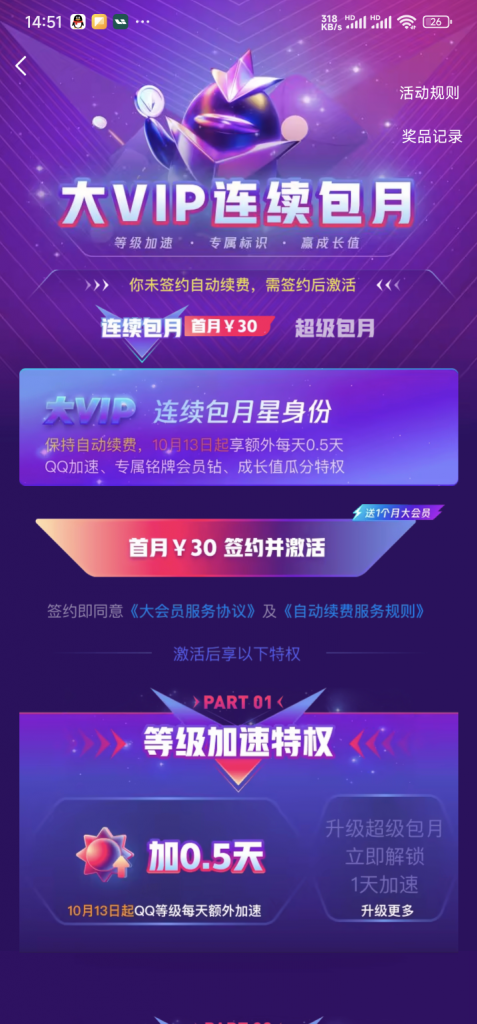 从2023年9月27日0点起,所有QQ用户均可通过特定活动页面,签约大会员自动续费,并主动升级超级包月星身份特权,从而完成加速任务。用户只需从【QQ抽屉页】-【QQ会员官网】-【大会员官网】-【活动精选】获取活动链接,按照提示操作即可轻松完成升级。
