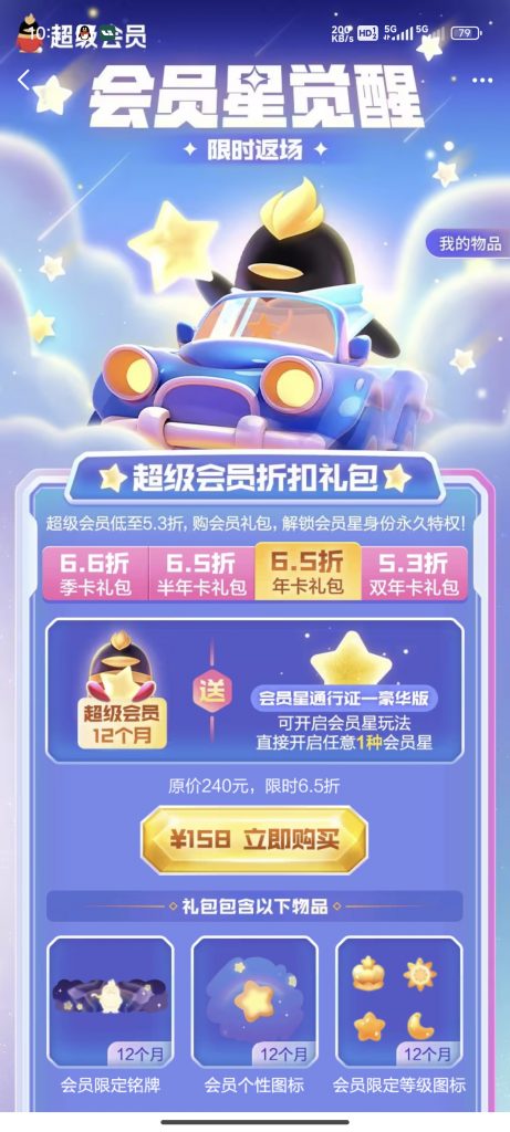 - 双年卡礼包:24个月超级会员,提供长达两年的等级加速包,让你的等级飞速提升。
